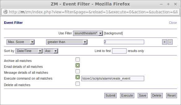 Now we come to the good part, it’s good to have working camera’s and recordings of all detected motion but there should be ways to trigger something when motion is detected. You can set up ‘filters’ which will trigger an action whenever motion is detected, in my case I’ve tried to set up a script that will play an alarm noise in the living room ( using a set of cheap speakers which directly connect to the audio card ), this to let the possible burglars know that something has noticed their behaviour (this could be enough input to scare them away):